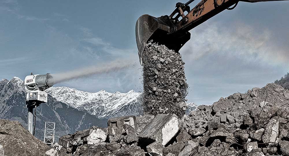 Integrovaný otočný čap turbíny umožňuje pokrytie širokého polomeru. Vodná hmla je efektívna pri spájaní prachu a jeho vynútení na zem, čím chráni zdravie zamestnancov a susedných obyvateľov, vyhýba sa znečisteniu životného prostredia a budov a predchádza poškodeniu technického zariadenia.Spoločnosti, ktoré môžu zaručiť čisté postupy demolácie, majú značný náskok pred svojimi konkurentmi, pretože spĺňajú neustále prísnejšie požiadavky a zákonné predpisy.