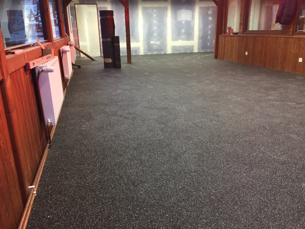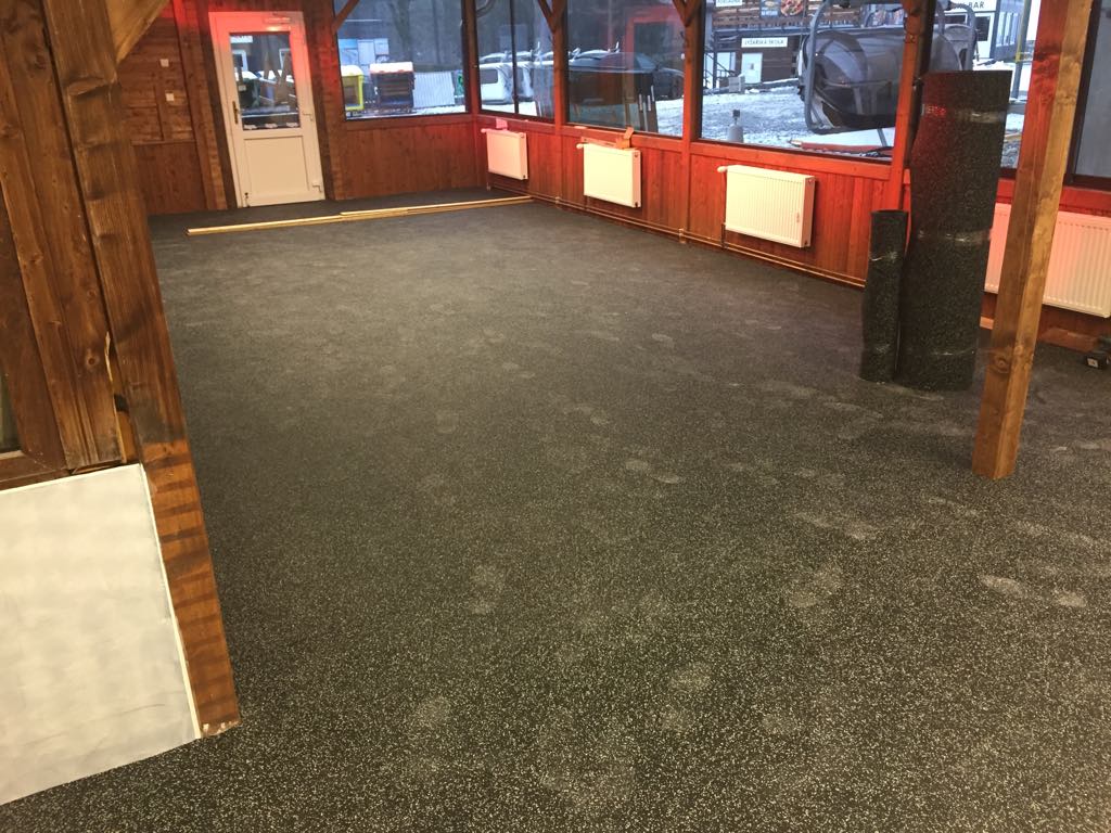 Sportovní podlahy SPORTNEIGE Lyžařský areál Myšák. Ski Areál Myšák se může pochlubit novou kvalitní protiskluzovou podlahou. IDS podlaha SPORTNEIGE v tloušťce 6mm 85% recyklovaného černé gumy, 15% barevných EPDM zrn. Sportovní podlahové krytiny pro široké využití, lyžařská střediska, zimní stadiony, šatny, lyžařské prostory, obchody, restaurace, turistické kanceláře atd